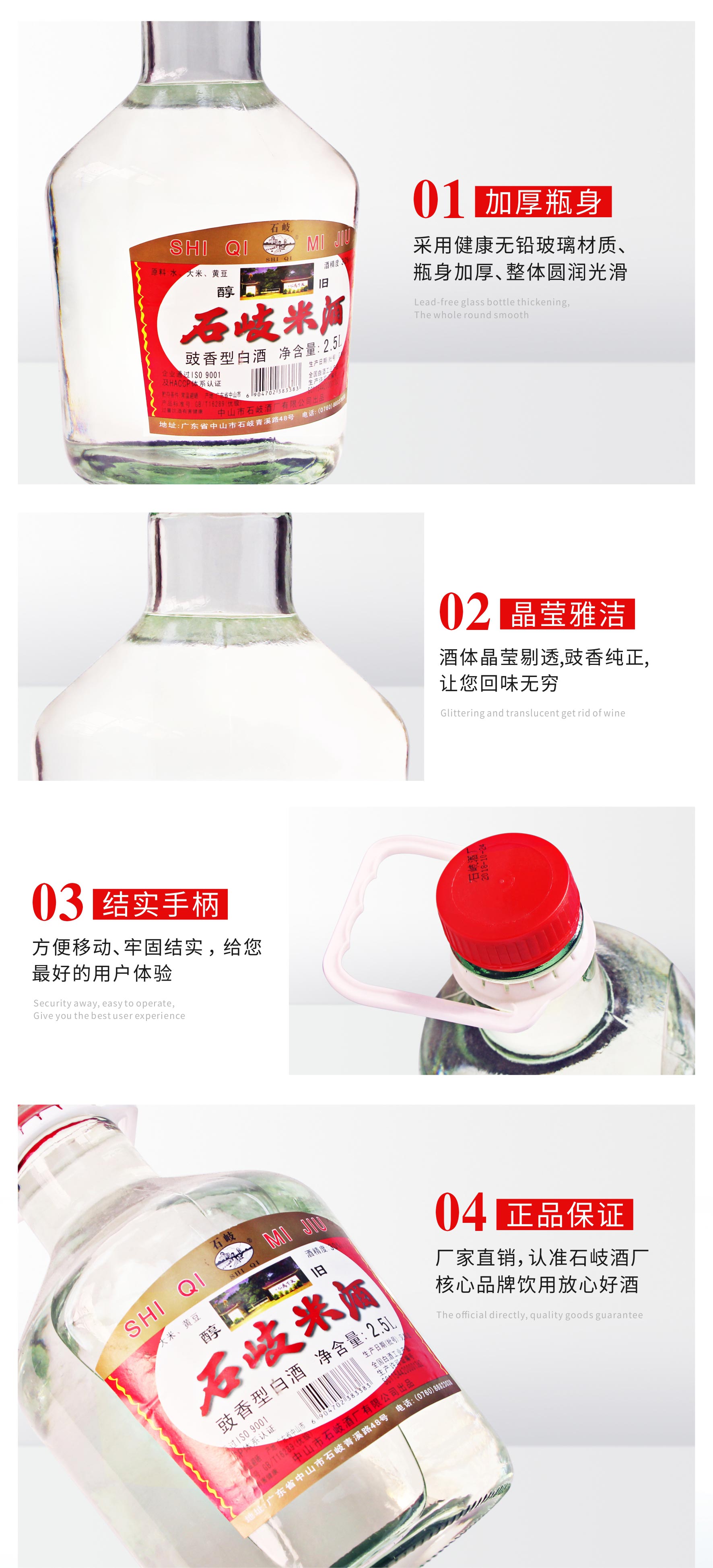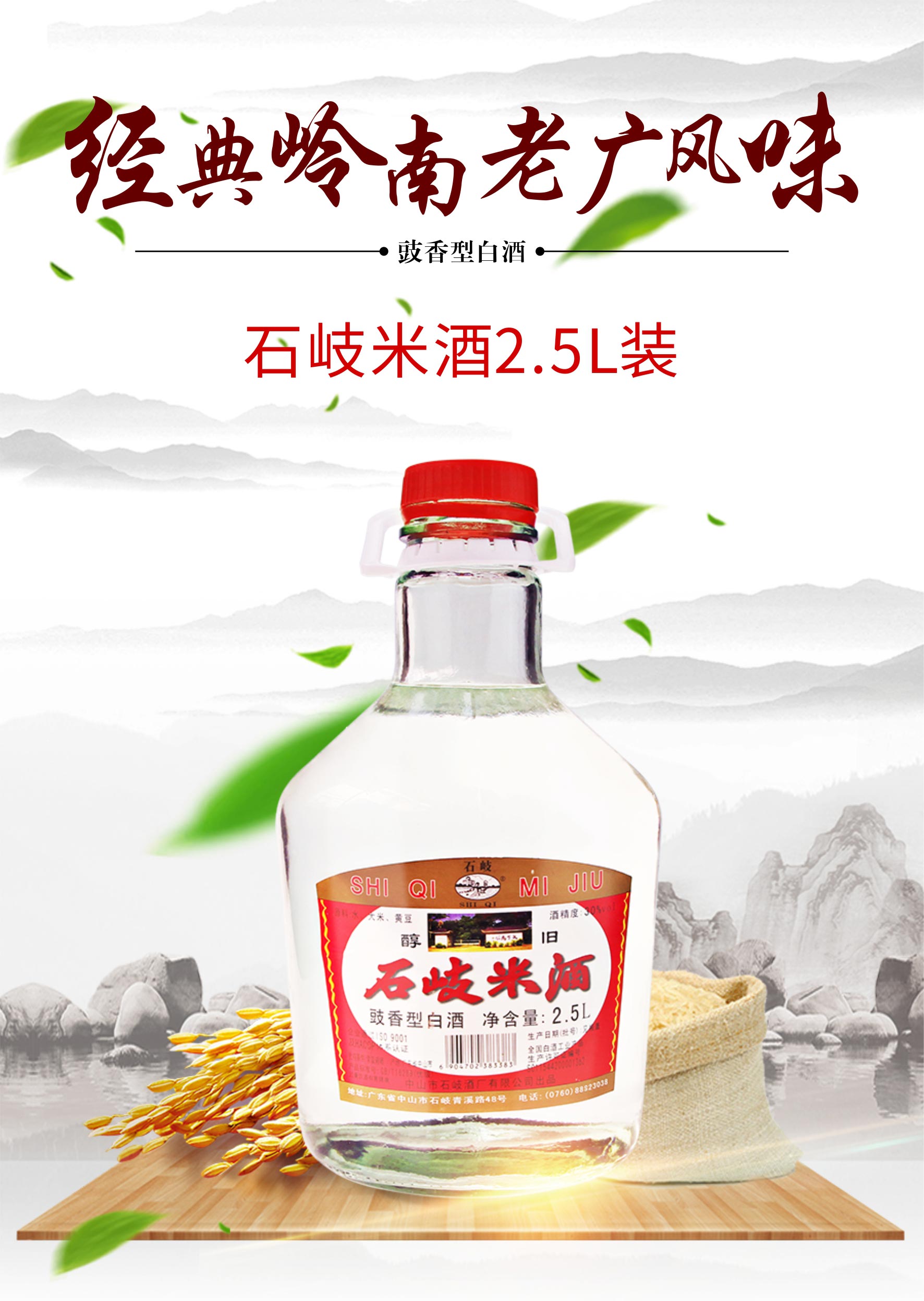 产品名称:石岐米酒 酒精度:30%vol 净含量:2.5L 香型:豉香型白酒 配料:水、大米、黄豆 储存条件:常温避晒 产地:广东中山 质量等级:优级