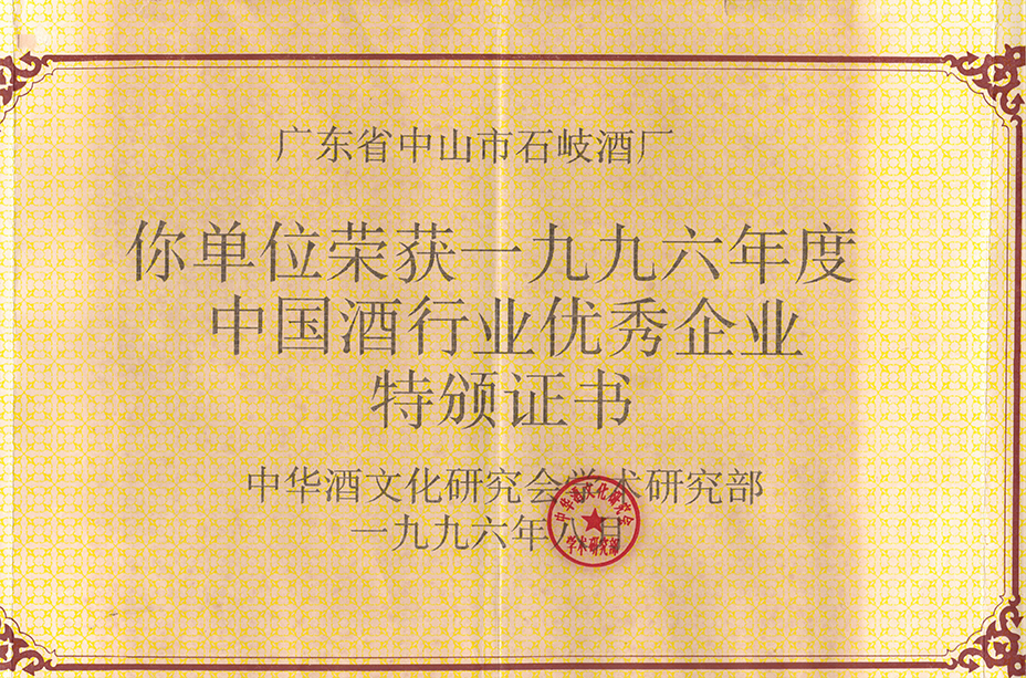 荣获1996年度中国酒行业优秀企业
