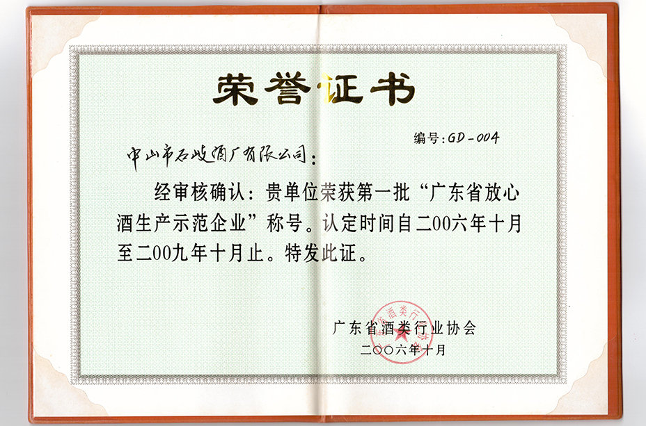 荣获广东省第一批“广东省放心酒生产示范企业”称号