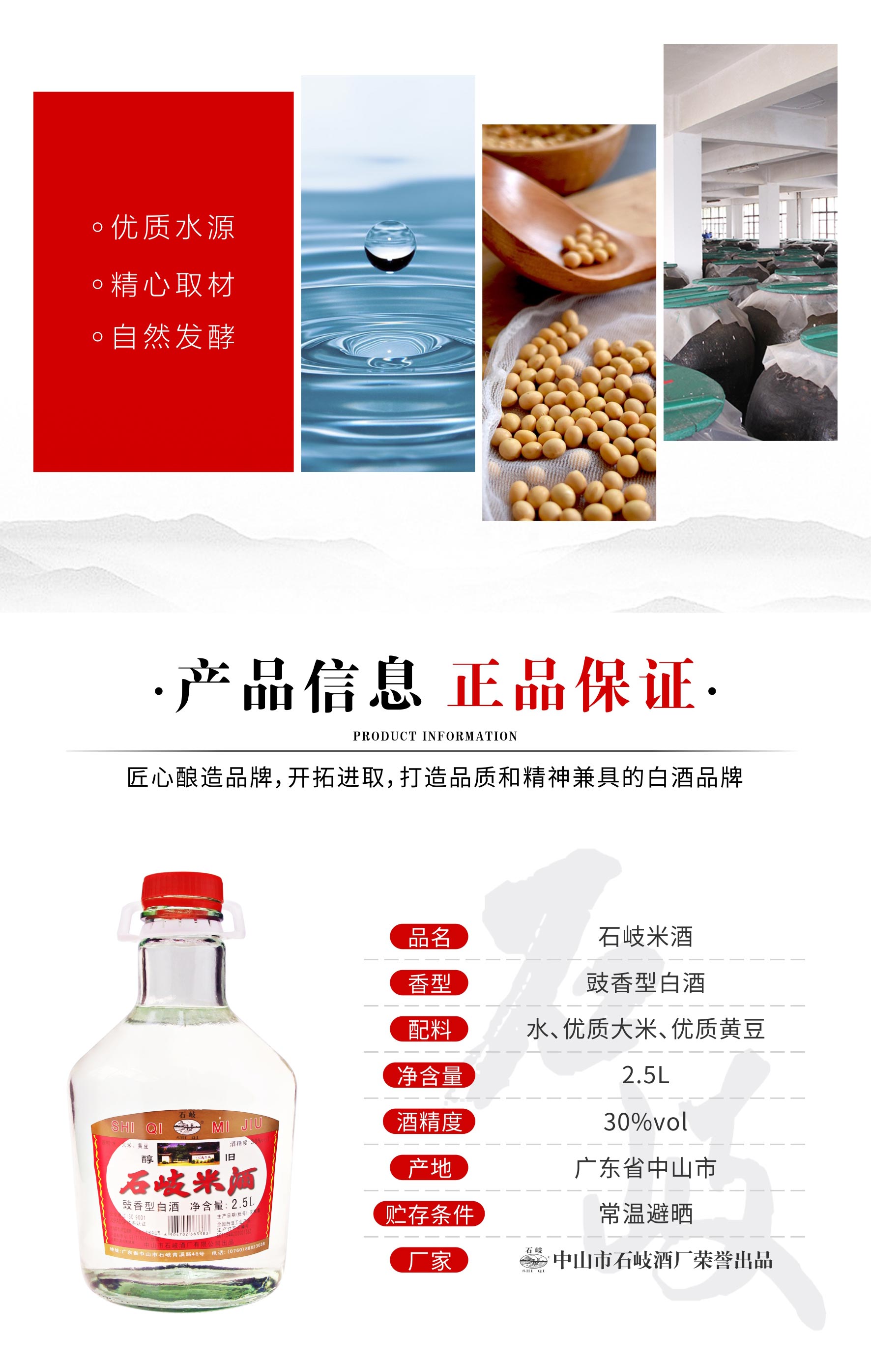 产品名称:石岐米酒 酒精度:30%vol 净含量:2.5L 香型:豉香型白酒 配料:水、大米、黄豆 储存条件:常温避晒 产地:广东中山 质量等级:优级