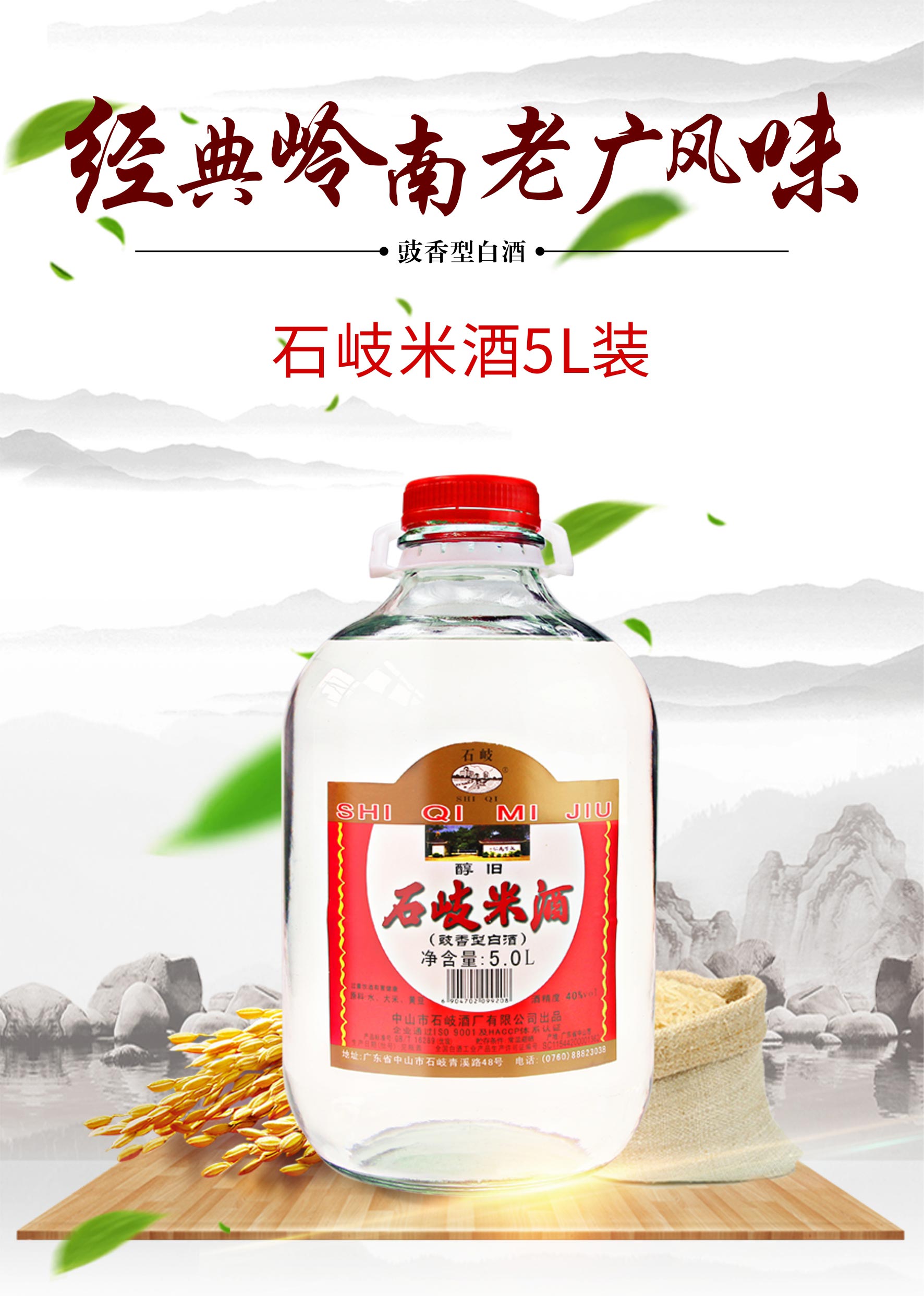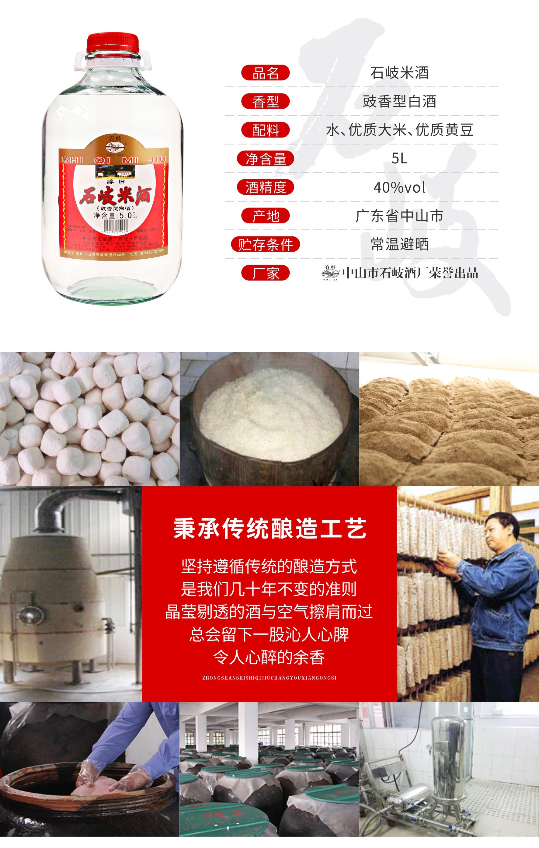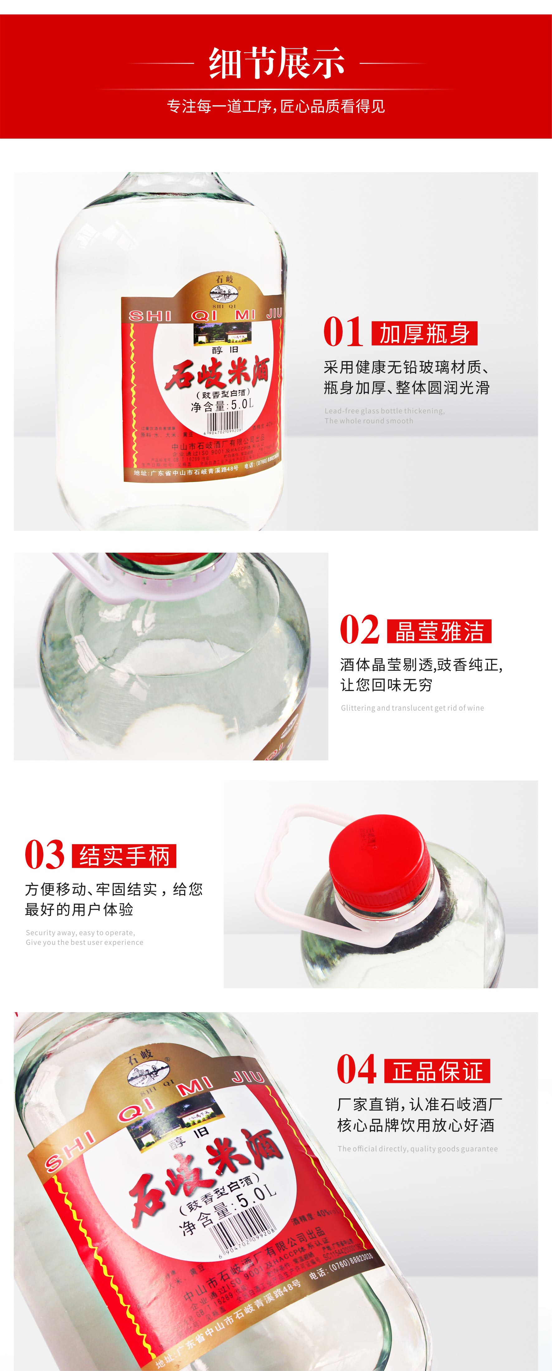 产品名称:石岐米酒 酒精度:40%vol 净含量:5L 香型:豉香型白酒 配料:水、大米、黄豆 储存条件:常温避晒 产地:广东中山 质量等级:优级