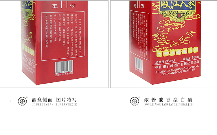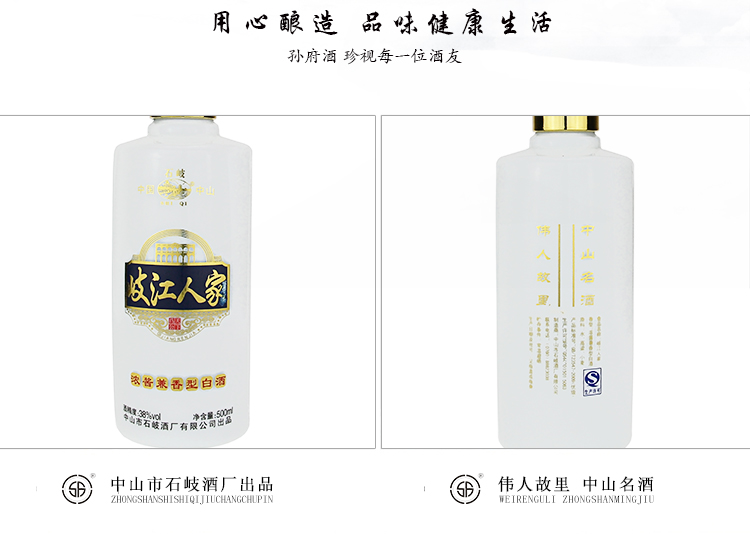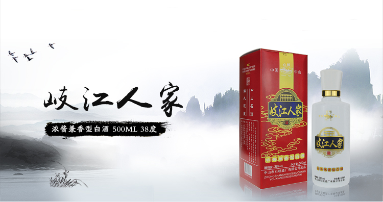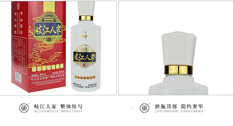 产品名称:岐江人家 净含量:500ml 酒精度:38%vol 香型:浓酱兼香型白酒 配料:水、优质高粱、优质小麦 储存条件:常温避晒 产地:贵州省茅台镇 厂家:中山市石岐酒厂有限公司 质量等级:优级